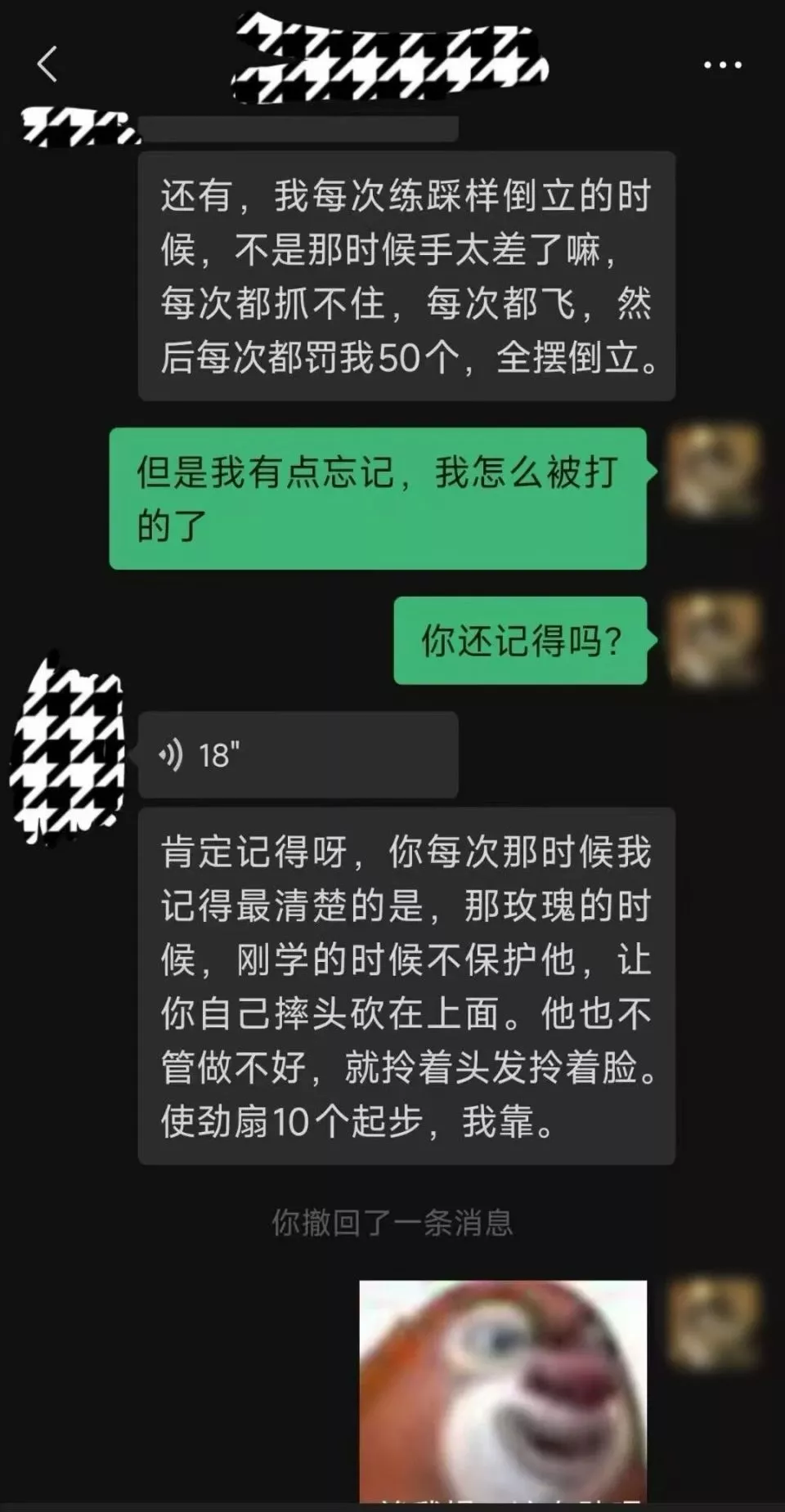 晋守宣向南风窗展示了一段微信聊天截图。对话显示,小佳曾通过“队友”试图回忆日常训练中被教练打骂的更多细节,这位“队友”提及,二人老是被教练扯头发、扇耳光,威胁“你再说一遍我脚痛”、拎着头往墙上撞等。