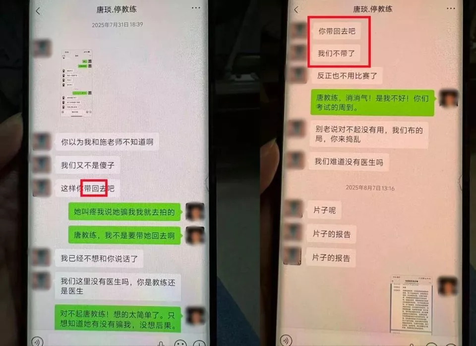 晋守宣称,唐琰的反应让她始料未及,却唯恐惹恼了教练,最后连连道歉。她唯一“壮了胆子”回复的一句话是:“如果没有上比赛,脚伤了就去医,有医保。”但这个信息很快又被淹没,小佳继续参训和测验。