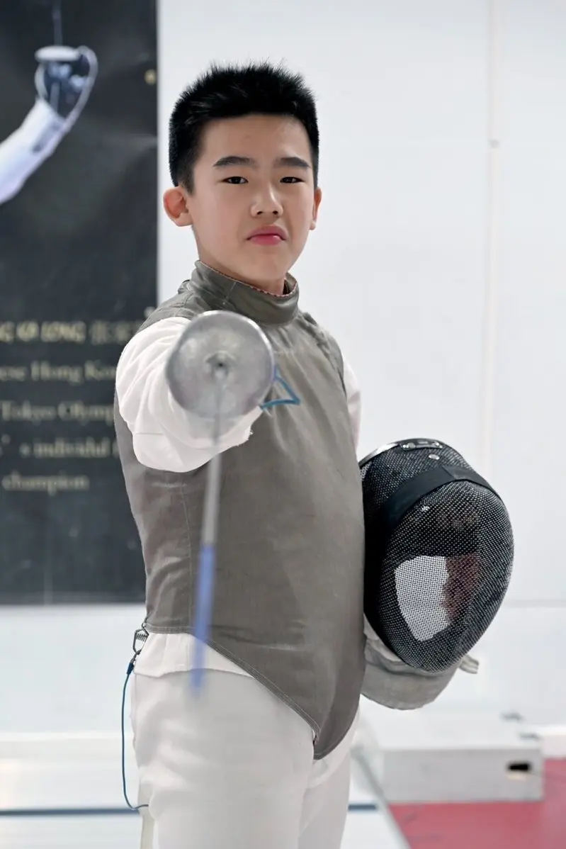 王孟迪手持面罩与花剑面对镜头,年纪虽轻,已在全国赛事中崭露头角。(记者许振辉 / 摄影)