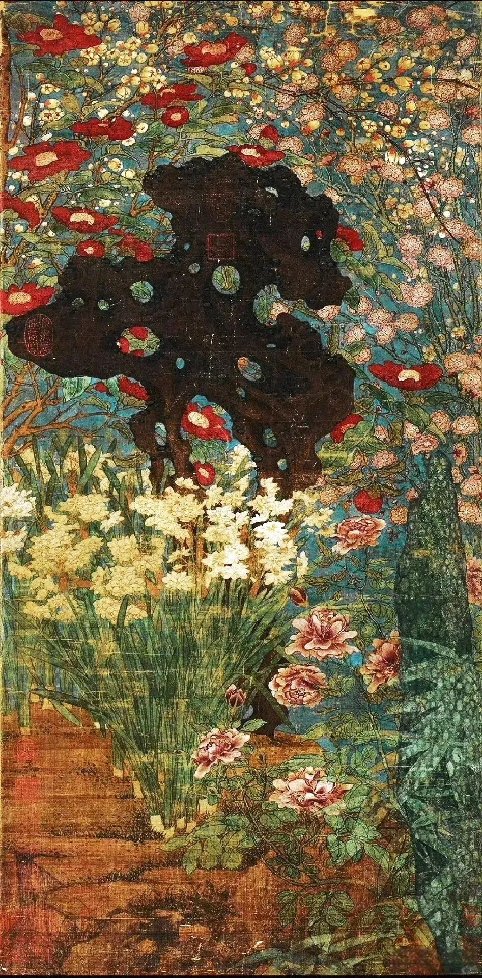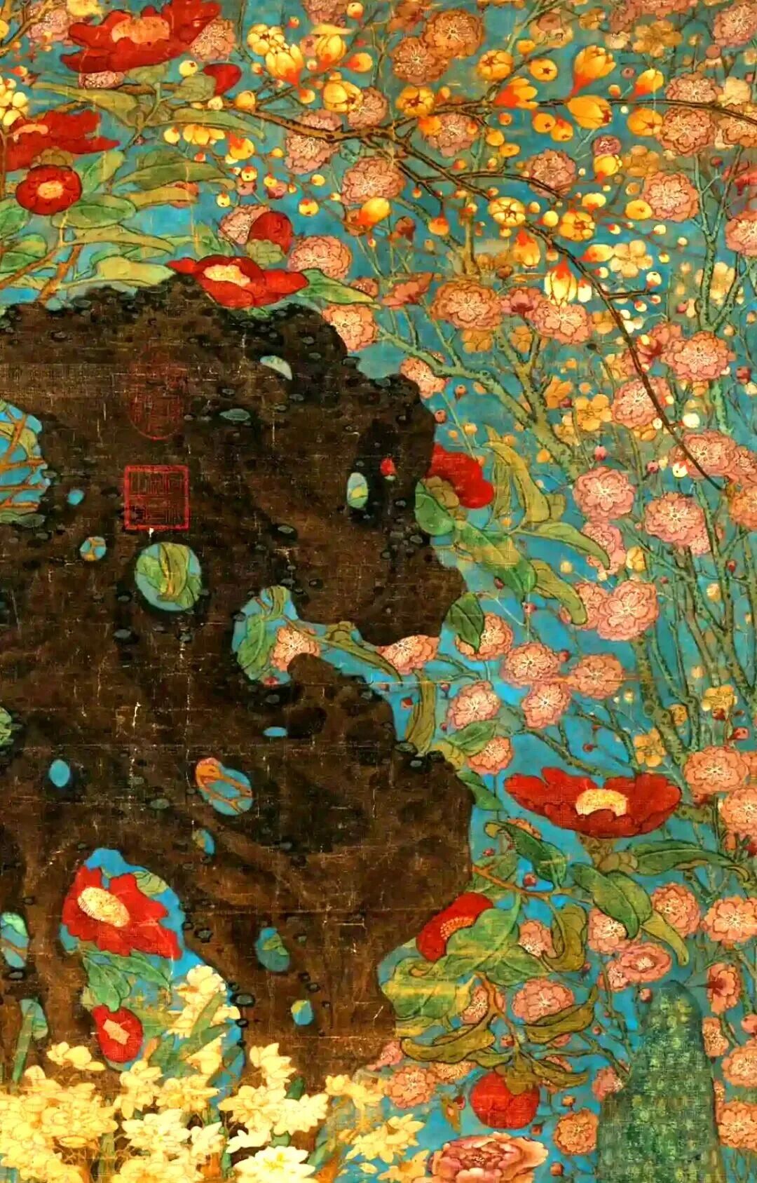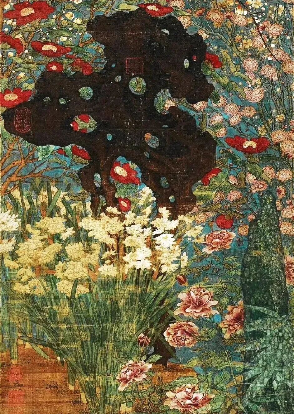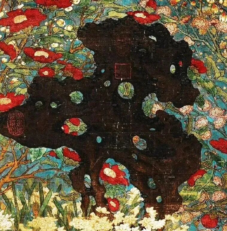 先说这构图,赵昌是个“强迫症晚期”患者。画面中央立着块太湖石,像块大巧克力蛋糕,周围簇拥着梅花、山茶、水仙、长春花,连坡地上的野菊都来凑热闹。花朵们挤得密不透风,连片叶子都舍不得留白,仿佛在说:“新年就要满满当当,福气才跑不掉!”这种“填鸭式”构图,搁现在叫“密集恐惧症福音”,但在宋朝,这叫“富贵逼人”。
