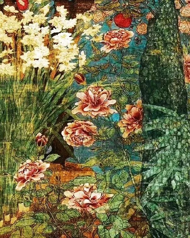 赵昌的笔触,那叫一个“细”。花瓣的纹理、枝干的转折,连水仙叶子的脉络都画得清清楚楚,像用显微镜观察似的。但他又不完全写实,太湖石上方的花枝,像装饰图案一样环绕,带着点“平面壁纸”的趣味。这种“半写实半装饰”的玩法,搁现在叫“混搭风”,在宋朝,这叫“创新”。