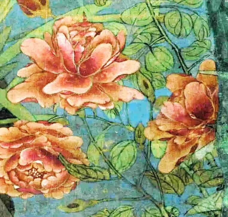 画里的花,个个都是“吉祥物”。梅花是“岁寒三友”,山茶谐音“善财”,水仙寓意“仙人”,长春花象征“长寿”。赵昌把这些花堆在一起,像在玩“新年祝福叠叠乐”——福气、财运、长寿,全给你安排上!连坡地上的野菊,都像在说:“别看我小,我也是来凑热闹的!”