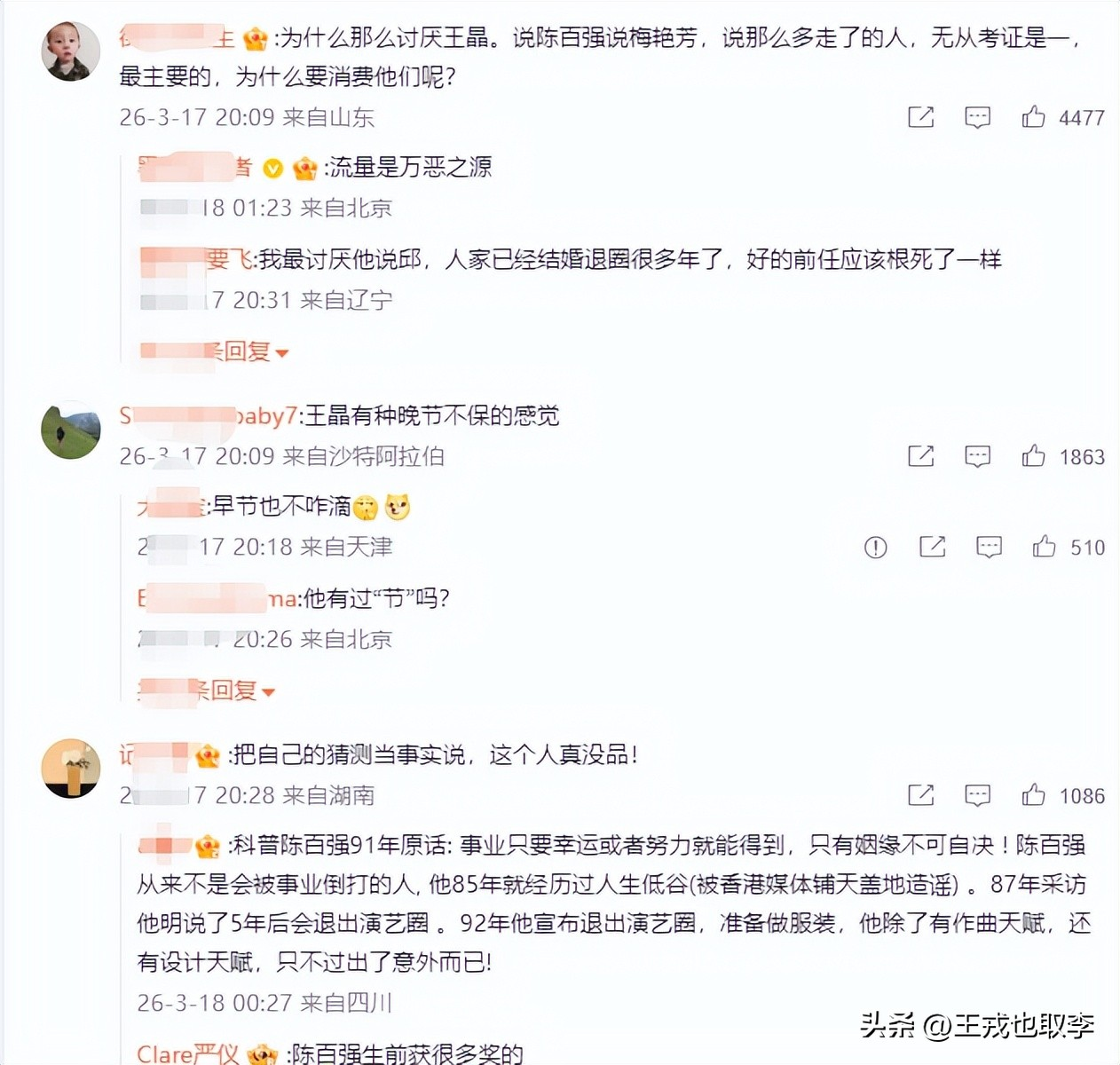 面对这种说法,网友并不认同王晶的观点。有的说“王晶有种晚节不保的感觉”,有的说“无从考证,为什么要消费他们呢?”甚至有的网友回怼“他一个拍三级片的导演。”