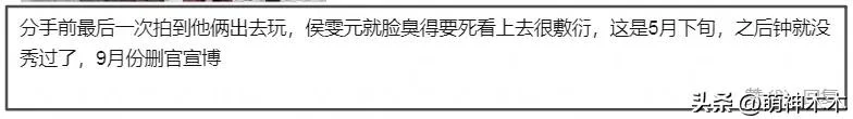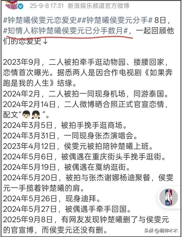 当时,侯雯元公开的女朋友是钟楚曦,2023年9月,两人牵手逛动物园恋情曝光,2024年2月14日,两人微博晒合影公开恋情,一直到5月,还有不少网友偶遇两人外出同游画面。但是在2025年9月,钟楚曦删了与侯雯元的官宣,知情人透露两人已分了数月。