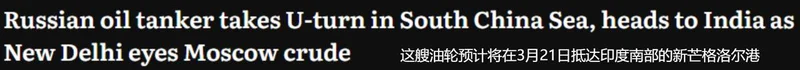 追踪信息显示,包括这艘在南海掉头的俄罗斯油轮在内,目前至少已经有7艘运载俄罗斯原油的油轮在行驶途中选择掉头,将目的地从中国改成印度。