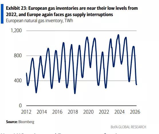 霍尔木兹封锁影响了全球约20%的LNG供应,卡塔尔和阿联酋的LNG已几乎全停。欧洲的处境比2022年更为脆弱:当时面对俄罗斯管道气是缓慢下降,有时间应对;这次是突然停供。欧洲天然气库存水平目前接近2022年的低点。