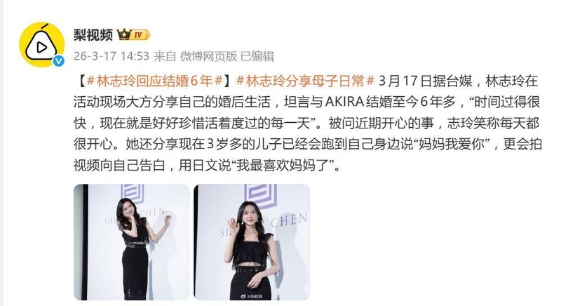 “时间过得很快,现在就是好好珍惜活着度过的每一天。”林志玲一句温柔的感慨,瞬间将她结婚6年多的生活状态推上了热搜。3月17日,她在品牌活动上大方分享婚后点滴,字里行间透出的满足感,让一众网友直呼“这碗狗粮我先干为敬”。