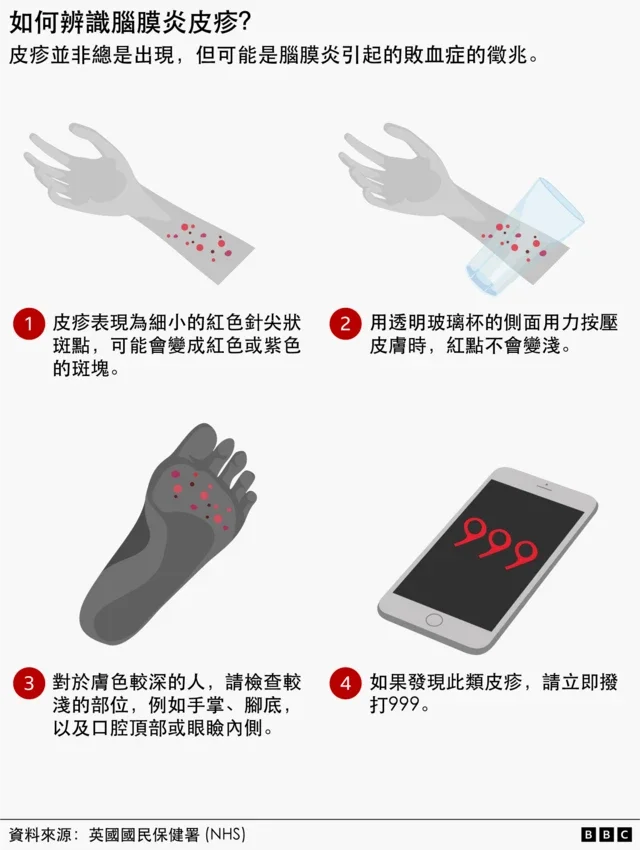 任何出现脑膜炎或败血症症状的人,应立即前往最近的急症室求医,或致电999。
