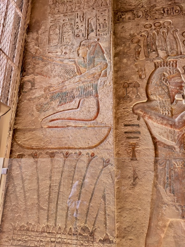拉美西斯三世的陵墓KV11,就是我们下一个目标。陵墓最初由第二十王朝的首任法老、拉美西斯三世的父亲塞特纳赫特(Setnakhte)建造,但由于意外凿穿了前任法老阿蒙麦西斯(Amenmesse)陵墓(KV10)而停工,塞特纳赫特也另葬别处(KV14)。拉美西斯三世继任后调整角度后重新开工,最后将其建成自己的陵墓。墓道里有大量壁画,除了《门之书》(Book of the Gates)、《大地之书》(Book of the Earth)、《冥界之书》(Book of Amduat)等丧葬文献作为死者灵魂穿越冥界的指南,还雕刻有《亡灵书》,生动地呈现法老的日常生活场景,例如美食、盔甲、财宝、以及阿拜多斯的朝圣之旅,这是每个埃及人都应该在生前或死后完成的朝拜。壁画雕刻细腻、色彩鲜艳、并保存完好,令人印象深刻。