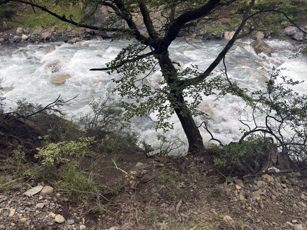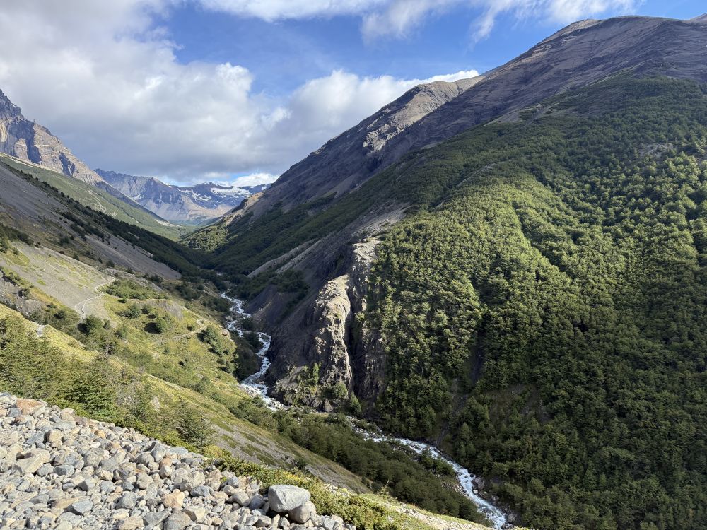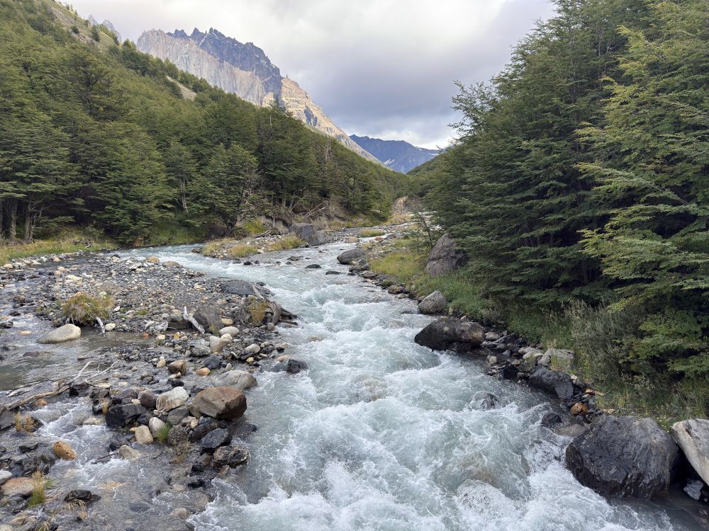 这天的天气不错,基本没有下雨。沿途很长一段路都沿着奔流咆哮的阿森西奥河(Rio Ascencio)行走。我在途中行走时不慎摔跤,险些落入阿森西奥河的激流,目睹我摔跤情景的一支西班牙-智利团队的徒步者十分震惊,他们说我是从死亡线上回来的幸运者。因为阿森西奥河水来自于高山融雪,水温只有5度左右,而且河水湍急,巨石耸立,人在水中不可能站立,岸上的人也几乎无法救助。几分钟时间落水者就可能溺水丧生。具体情况我将另文介绍。