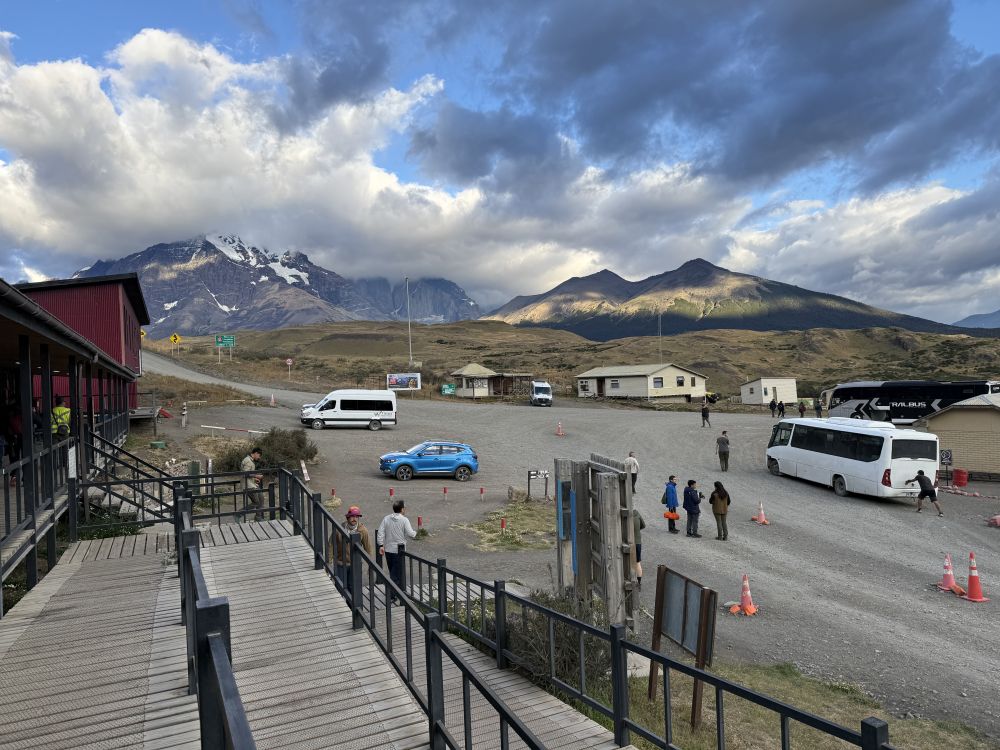 第一天清晨6:30,我们从纳塔莱斯港(Puerto Natales)出发。乘坐大巴前往百内公园的入口。在这里办理入园手续。然后大巴继续前行,将我们送到游客中心,这里是公路交通能够到达的最远点。第一天山径的起点和终点都是游客中心。我们只需携带当天需要的食物,饮水和衣物,余下的所有物品留在大巴上。等我们返回时,大巴将载我们去旅游公司在附近的一个营地过夜。