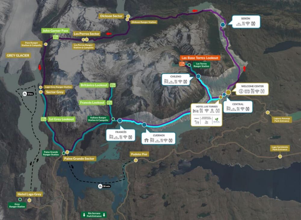 W线有5个重要节点。上部三个节点,分别是W最右端的顶点-百内三塔,W的中间突出点-英国观景台和W最左端的顶点-格雷山屋附近的冰川观景台。W路线下方的2个节点,一个是没有明确标识的山径起点-但人们通常是从游客中心开始。另一个是左下角的大百内营地/公园管理站(Paine Grande)。