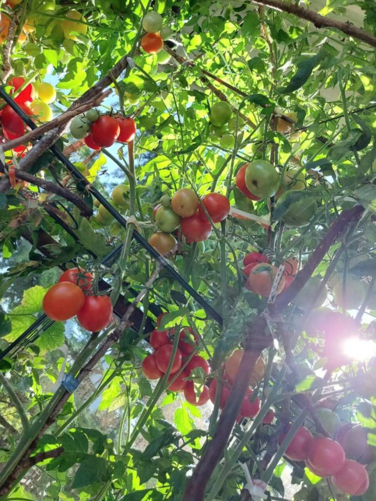 没闹懂是苏打,酵母,椰糖,还是“尿黄金”发威,番茄植株拔节疯长,一米,两米,长成“番茄树”。于是一边加高篱笆,搬来折叠梯,给那些“出头鸟” 剃头。“番茄树”依然不屈不挠,开枝散叶,很快长成一片郁郁葱葱的 “丛林”。