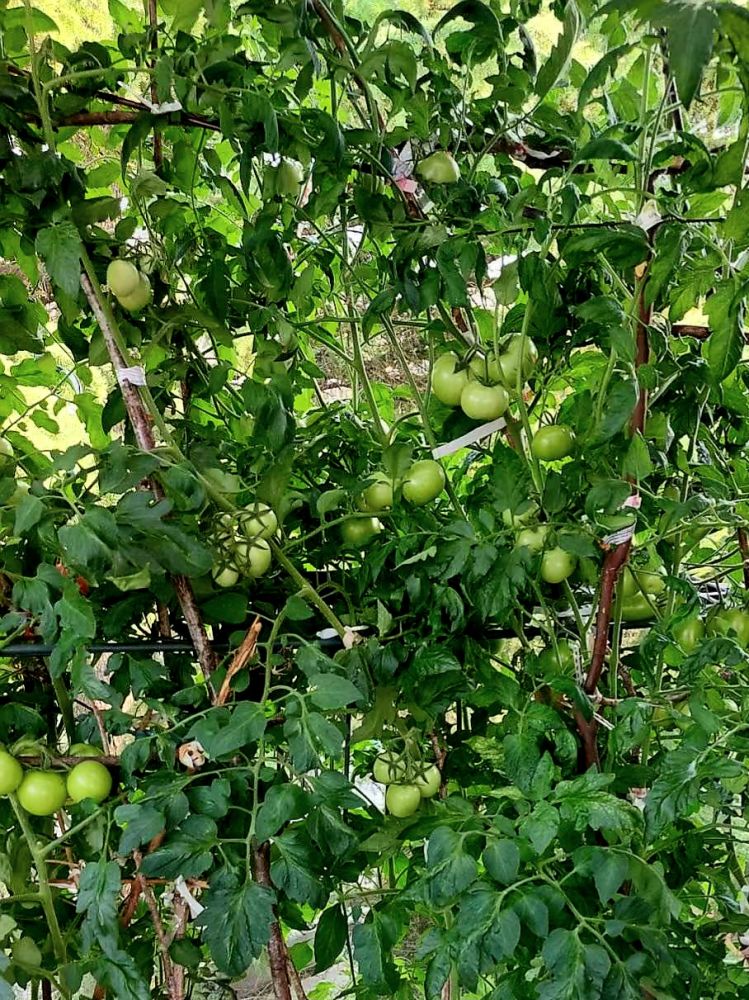 到了春末,番茄树开出一簇簇小黄花。快到夏末,青青的果实缀满枝头:12株大西红柿,1株罗马番茄。大西红柿每株挂果4层,每层结果6到7颗。那株罗马番茄也挂果4层,每层结果11到14颗。如果不掐头,好像每个植株还会多挂两三层果?