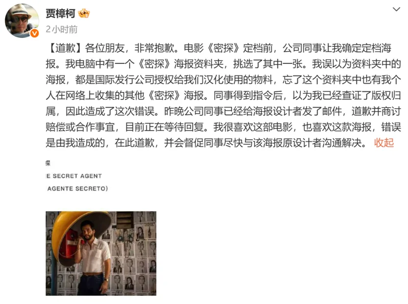 3月18日,导演贾樟柯因电影《密探》定档海报涉嫌侵权巴西设计师作品,在微博公开发文道歉: