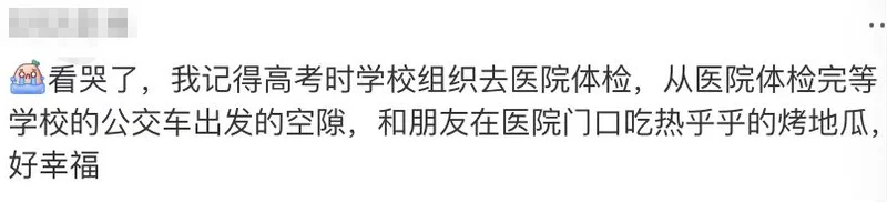 有的是高考体检,等校车的间隙和朋友一起在医院门口分享的烤红薯,是“恰同学少年”久久不变的同窗情谊;