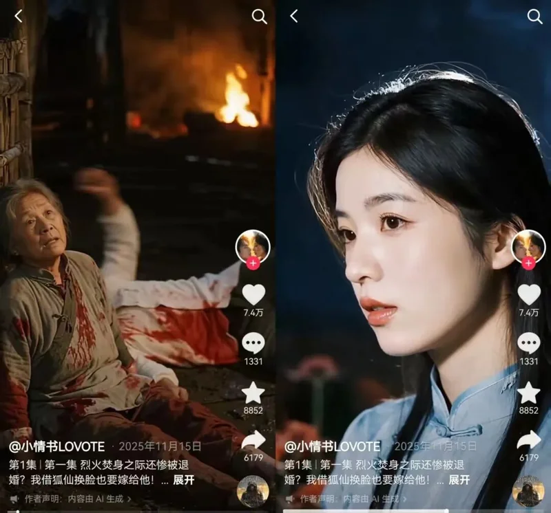 “很多短剧内容高度雷同,行业里的人心知肚明。”老赵剪辑过太多这样的片子,剧情换汤不换药。而AI伪真人短剧出现后,数据上看,传播效果与真人剧相差无几,成本却低得多——不需要复杂的后期,不需要操心演员塌房,省下的钱可以全部投流。”