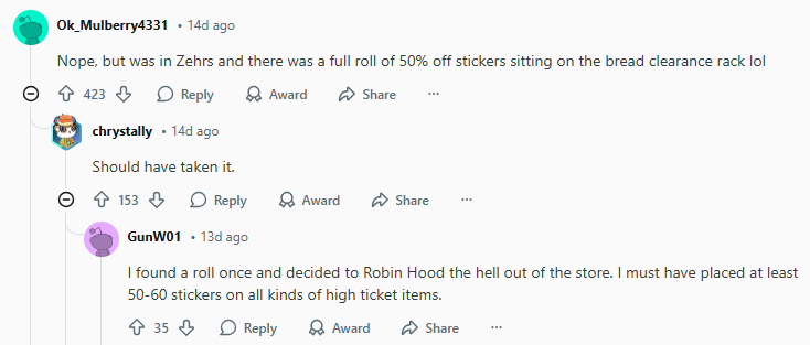 还有网友回复说:“我之前还真捡到过一卷,然后直接在店里‘罗宾汉式操作’了一把。我起码给各种高价商品贴了50到60张折扣标签。”