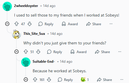 一位自称在Sobeys工作过的网友说:“我曾经把这些打折贴纸卖给了我的朋友。”