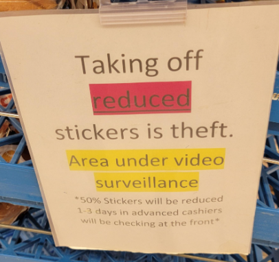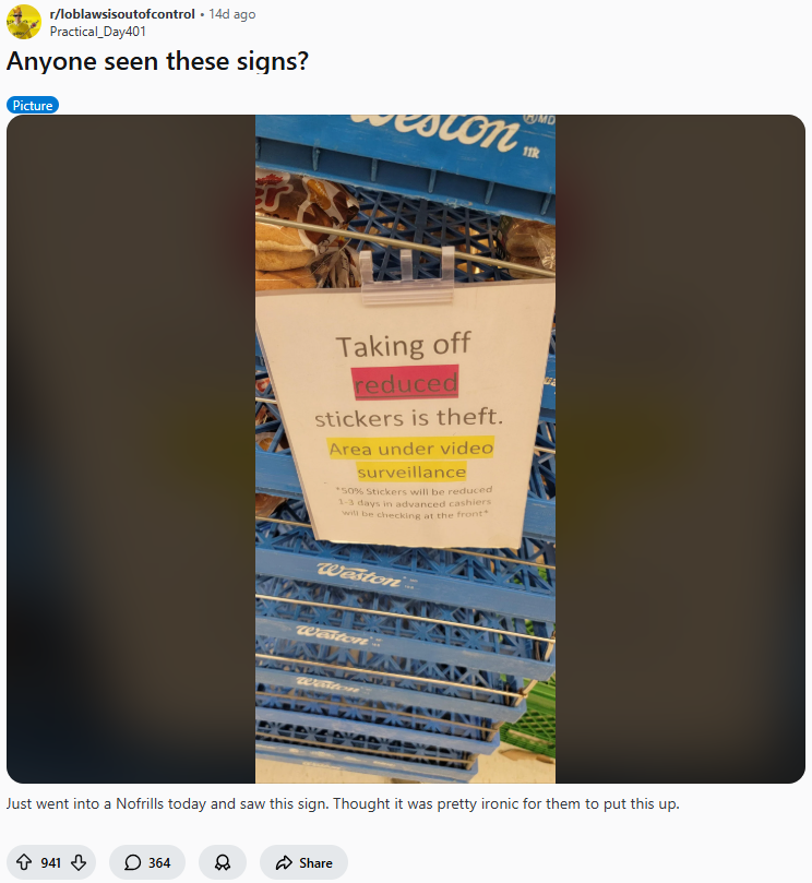 本月初,一名顾客在Reddit上的“Loblaws is out of control”版块分享了这张照片,称是在No Frills店内看到的。告示牌上写着:“撕下打折标签属于盗窃行为。本区域有视频监控。50%折扣标签会提前1到3天贴出。收银员将在前台检查。”