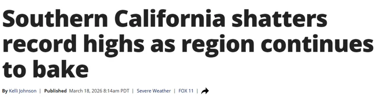 数据显示,南加州多地不仅刷新了当日最高气温纪录,部分地区甚至创下历史最热3月气温。