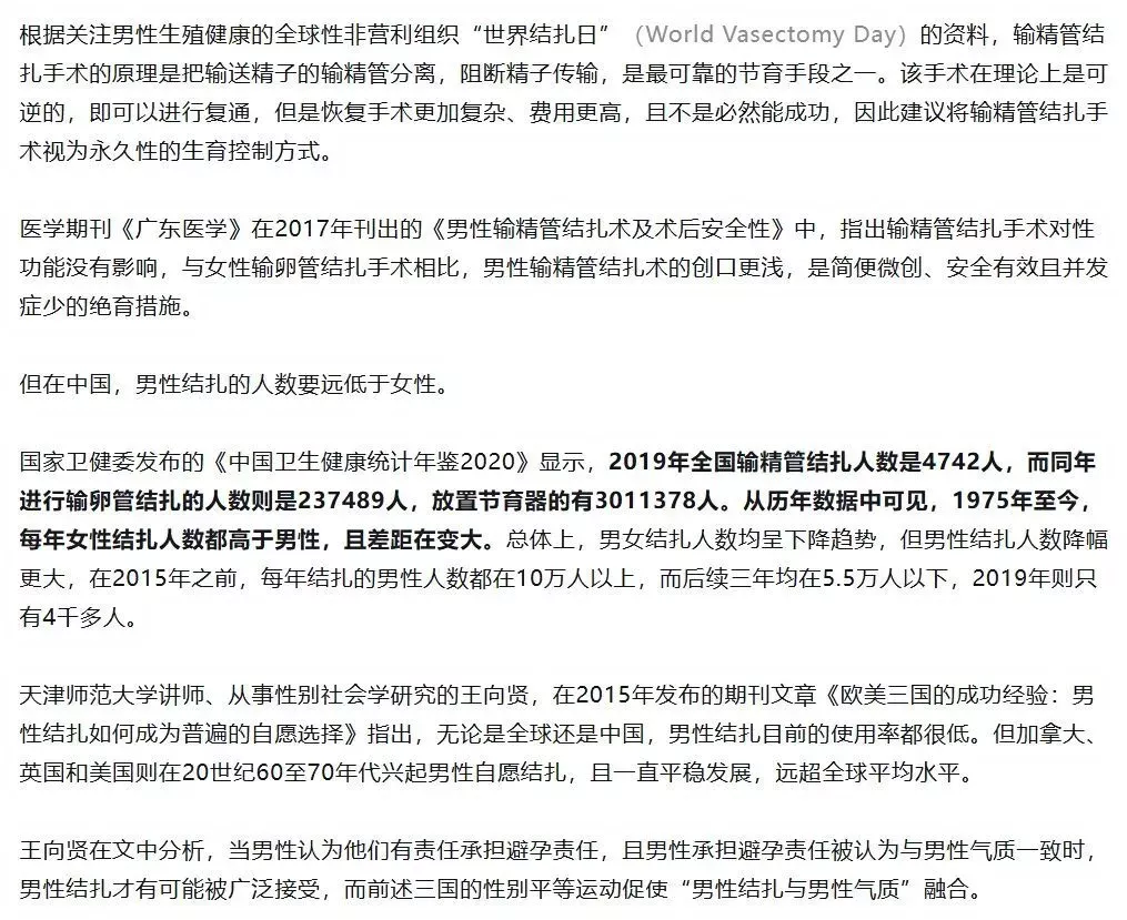 对比一下,2019年全年,我国男性结扎手术只有5000例不到。而女性结扎人数近14万,放置宫内节育器女性超300万。