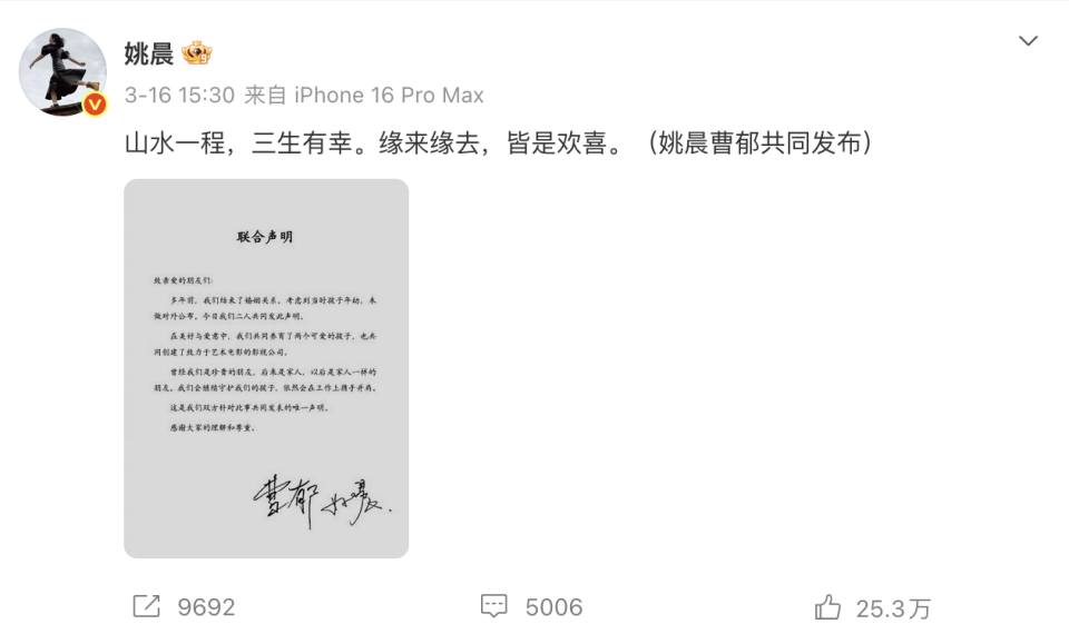 3月16日,姚晨突然在微博上官宣离婚的消息,表示“多年前,我们结束了婚姻关系,考虑到当时孩子年幼,未做对外公布”。
