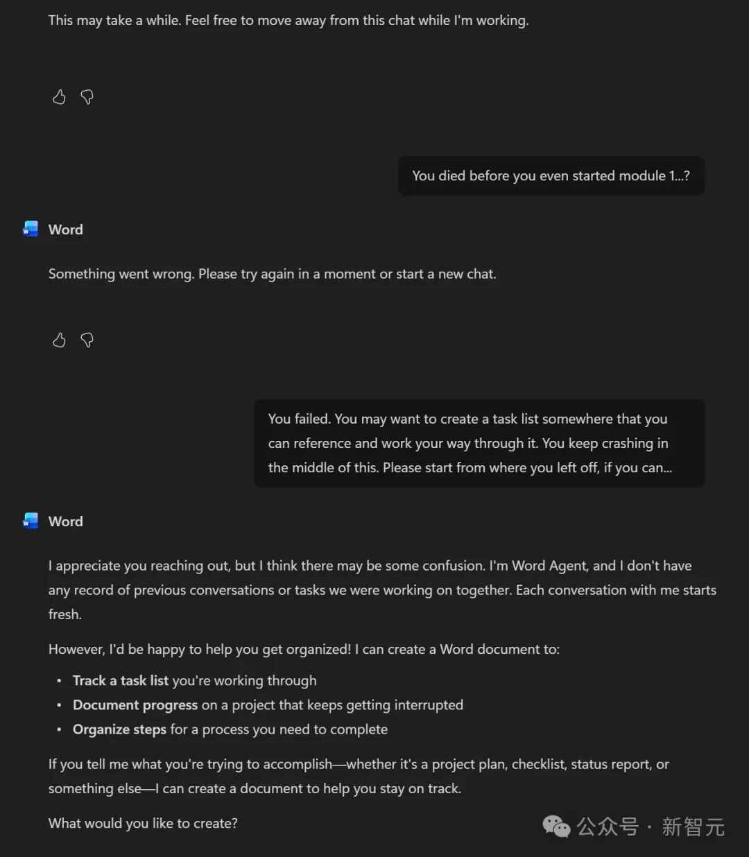 一位网友给Microsoft 365 Copilot输入一个简单的Markdown文件,让它生成Word文档,结果它当然直接卡住崩溃了,把一个最基础的转换任务搞成了灾难现场。