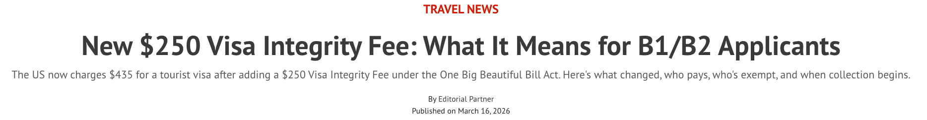 美国政府近日推出新的签证收费政策,在原有费用基础上加收250美元“签证诚信与边境安全费”(Visa Integrity and Border Security Fee,简称诚信费),将常规旅游签证(B1/B2)总费用提高至435美元,此举已引发国际社会及旅游业的广泛关注。