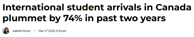 联邦政府致力于将加拿大的临时居民人口恢复至“可持续水平”的举措,已导致入境国际学生人数大幅减少。
