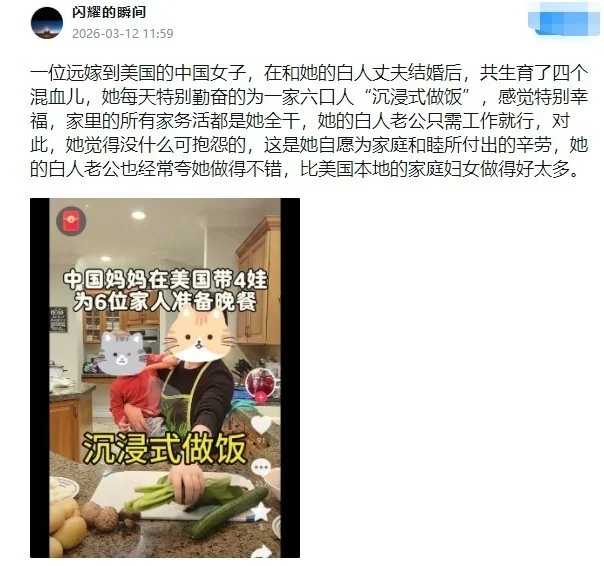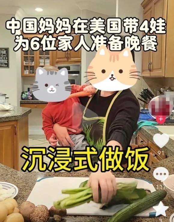 中国网红远嫁美国,生4个小孩还全包家务,发视频直言自己很幸福,近年来,随着短视频平台的发展,越来越多的海外生活博主进入大众视野,其中,一位远嫁美国的中国女网红就引发了不少网友讨论,她与一位白人丈夫结婚后,已经生下四个孩子,一家六口生活在美国,她的账号内容几乎全部围绕家庭日常展开,其中最常见的,就是她为全家人“沉浸式做饭”的视频。