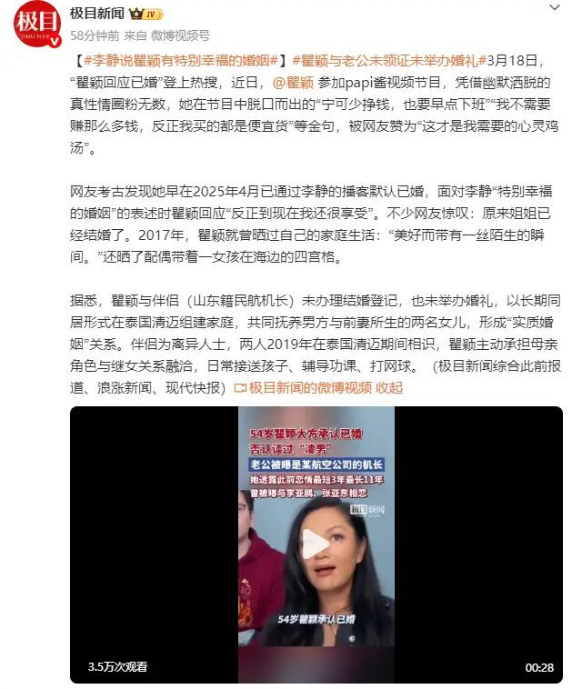 网友考古发现她早在2025年4月已通过李静的播客默认已婚,面对李静“特别幸福的婚姻”的表述时瞿颖回应“反正到现在我还很享受”。