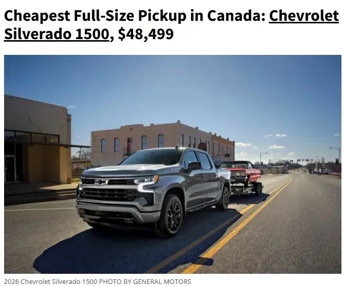 Chevrolet Silverado 1500 起价48,499加元(单排两驱),是全尺寸皮卡中入门门槛最低的选择。