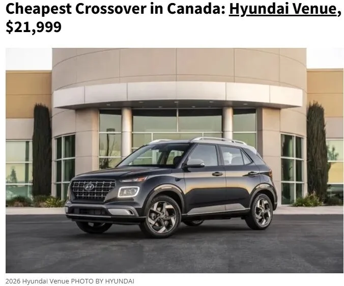 这里所说的“跨界车(crossover)”是介于轿车和SUV之间的车型,也常被称为“次紧凑型SUV”。Hyundai Venue 在2024和2025年已是该级别最便宜车型,并在2026年继续保持这一位置,同时也成为加拿大整体最便宜的新车。