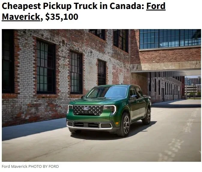 最便宜皮卡为 Ford Maverick,起价35,100加元。提供混动和燃油版本,其中混动版最省油,适合日常使用。