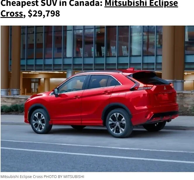 最便宜SUV为 Mitsubishi Eclipse Cross,起价29,798加元,是目前唯一低于3万加元的紧凑型SUV。标配四驱系统和1.5T发动机(152马力),配置和通过性较均衡。