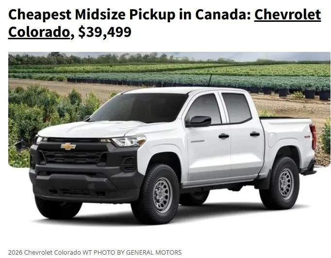 Chevrolet Colorado 起价39,499加元,凭借基础版两驱配置成为该级别最便宜车型,动力较强(310马力)。