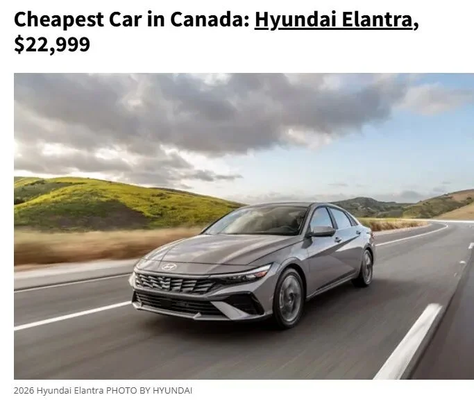 在2026年加拿大新车市场中,最便宜的车型由 Hyundai Elantra 夺得,起售价为22,999加元(另加约1,900加元运费)。由于 Nissan Versa 不再推出2026款,Elantra从去年的第二位升至第一。