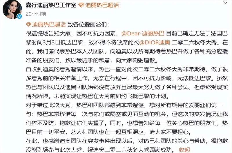 此前,3月初迪丽热巴原本要参加巴黎时装周,由于滞留迪拜导致无法按时抵达,而取消行程。3月4日,迪丽热巴通过微博报平安。