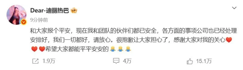 和大家报个平安,现在我和团队的伙伴们都已安全,各方面的事项公司也已经处理安排好,我们一切都好,请放心。很抱歉让大家担心了,感谢大家对我的关心。希望大家都能平平安安的。