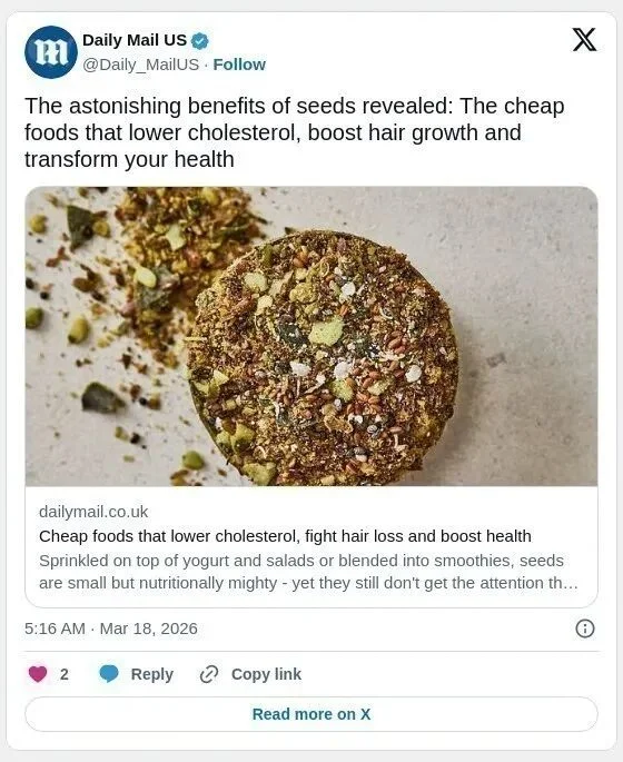 约翰斯顿提醒,选择种子时多样化比选择有机更重要,因为种子不属于农药残留高风险的“脏十二类”。合理搭配食用各类种子,可以在日常饮食中轻松获得丰富营养,支持消化、心脏、骨骼、皮肤及整体健康。