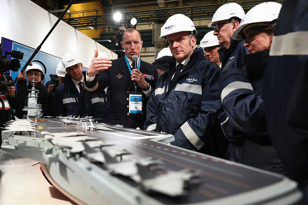 马克龙在南特市一处航母建造工地说,新航母的建造预计耗资近100亿欧元,能够创造就业岗位、惠及本国企业、发展国防工业。他强调,没有强大的国防工业,就会导致“军事依附、战略附庸和经济屈服”。