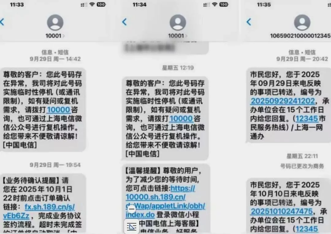 去年9月底,在上海生活的陈毅被停机近一个月。在停机前他同样收到了运营商发来的提示短信,告知他号码存在异常,将对号码实施临时性停机或者通讯限制。“我当时在开车,也没仔细看,还以为是什么诈骗短信。”直到到家后,他接到朋友的微信语音,问他怎么停机了。