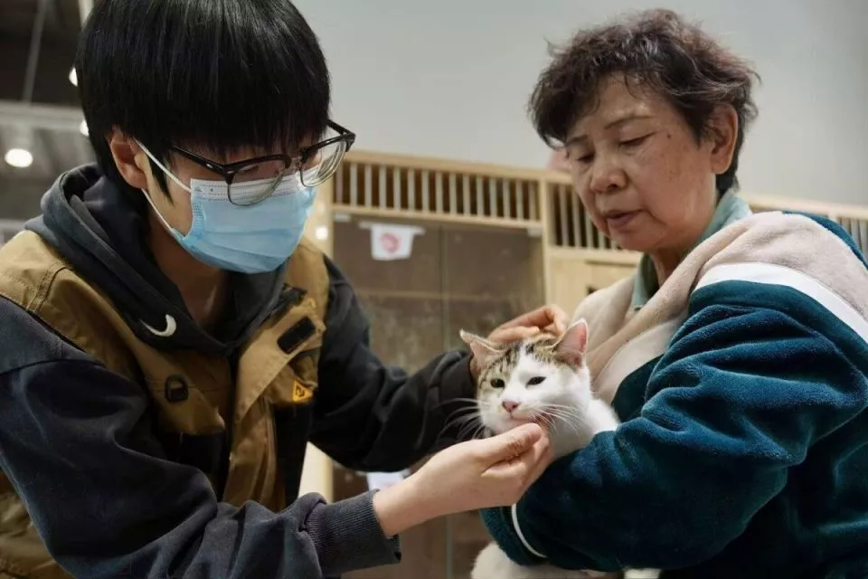 2026年3月11日,一位阿姨送来两只猫咪,园区的工作人员仔细检查猫咪的身体状况。