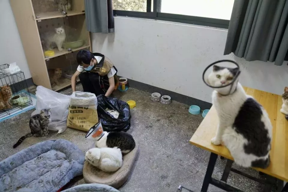 萤火虫港湾流浪猫乐园的隔离区域里,工作人员在给猫咪喂食、换水以及铲猫砂。
