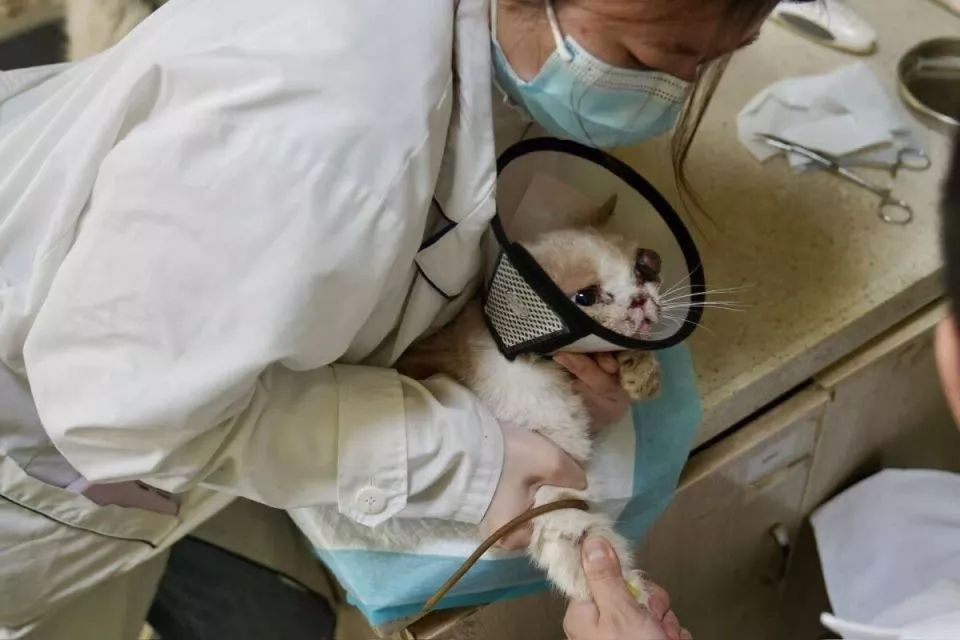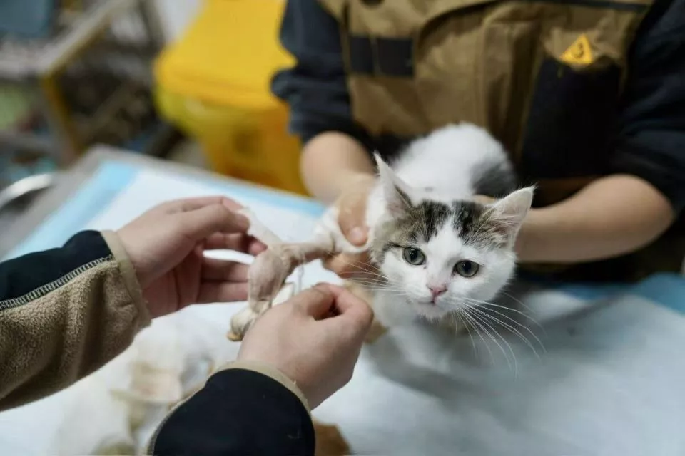 工作人员为一只猫咪换药包扎。
