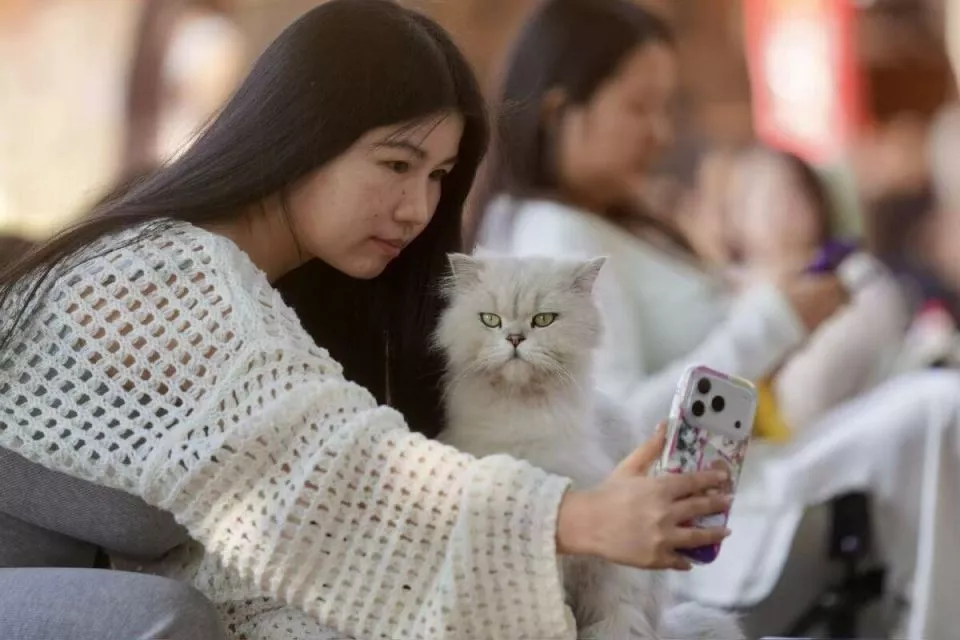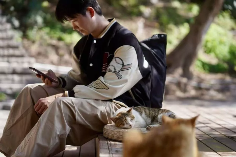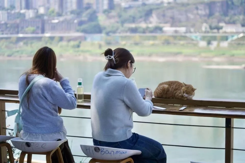 江边的风裹挟着几分潮湿,从重庆长江的水面徐徐吹来。草地、树荫道与木栈道间,随处可见猫咪的身影:橘猫慵懒地趴在石阶上晒太阳,狸花猫绕着人群的脚边打转,三花猫被游客抱在怀里轻轻抚摸。有人弯腰拍照,有人蹲地逗猫,而猫咪们则慢悠悠地从人群中穿行而过。