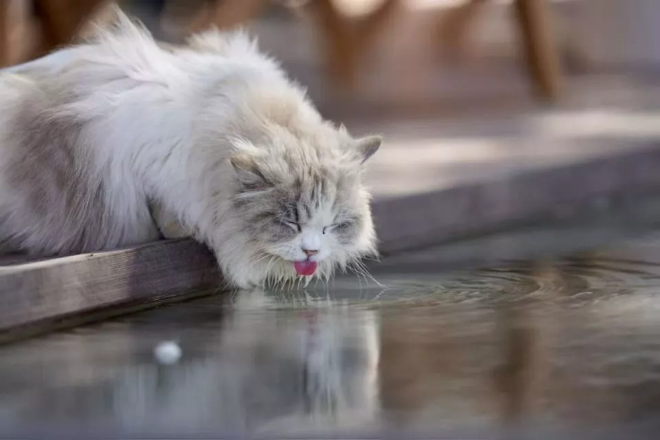 一只猫咪在园区的水槽旁喝水。