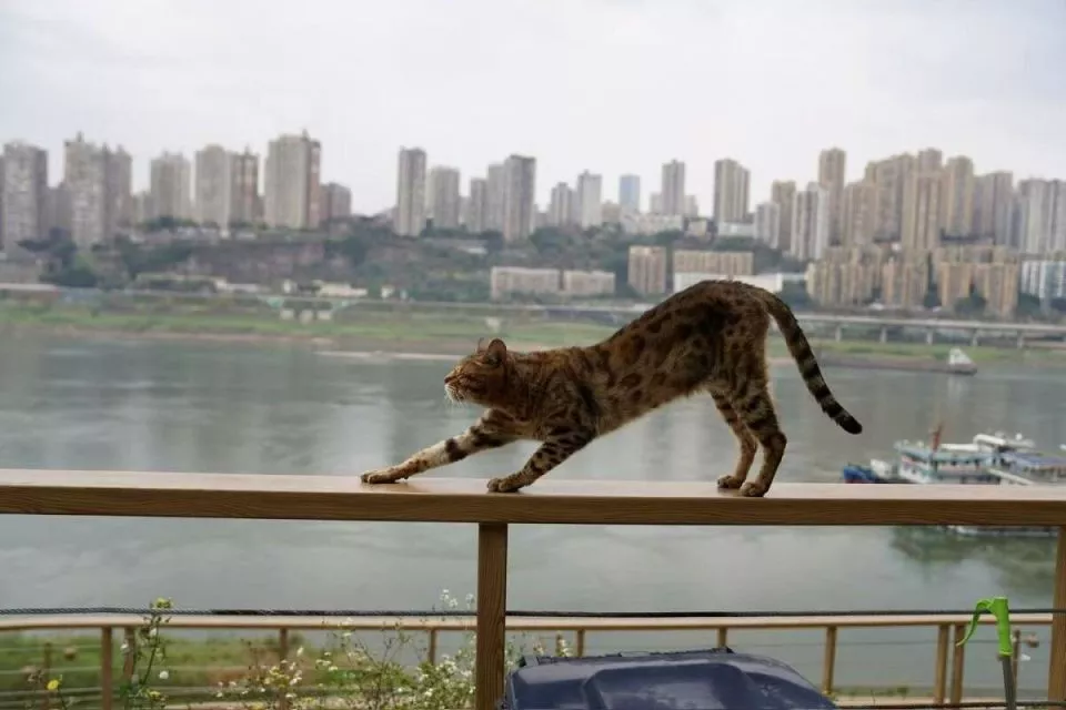一只猫咪站在长江边的栏杆上伸懒腰。