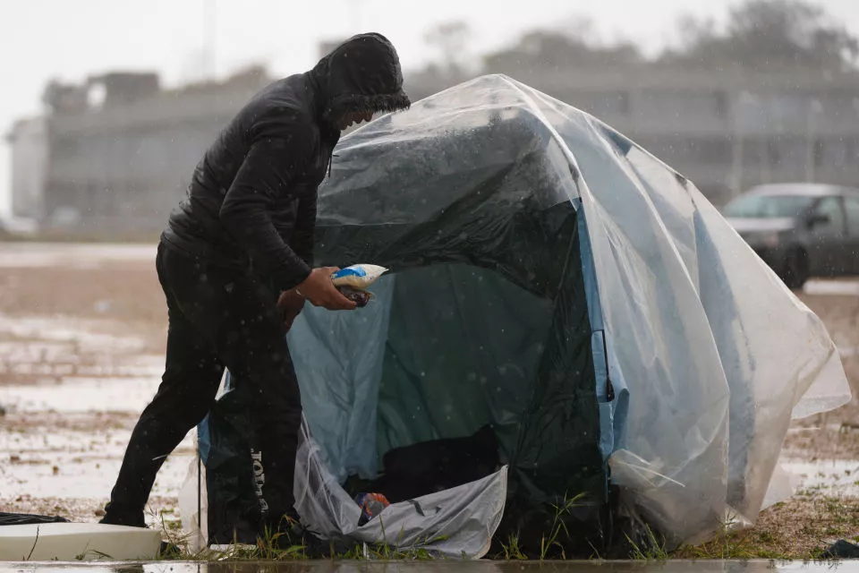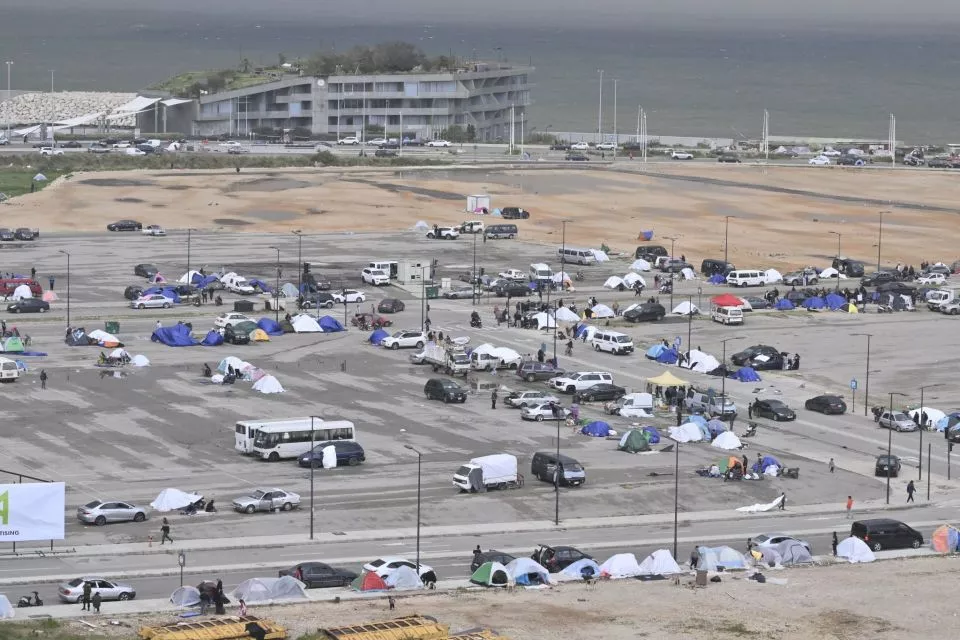 当地时间2026年3月15日,黎巴嫩贝鲁特,因以色列军队要求撤离而逃离贝鲁特南部达希耶地区的黎巴嫩家庭,在恶劣天气条件下于首都沿海地区的街道、公园及临时帐篷中避难。图/视觉中国